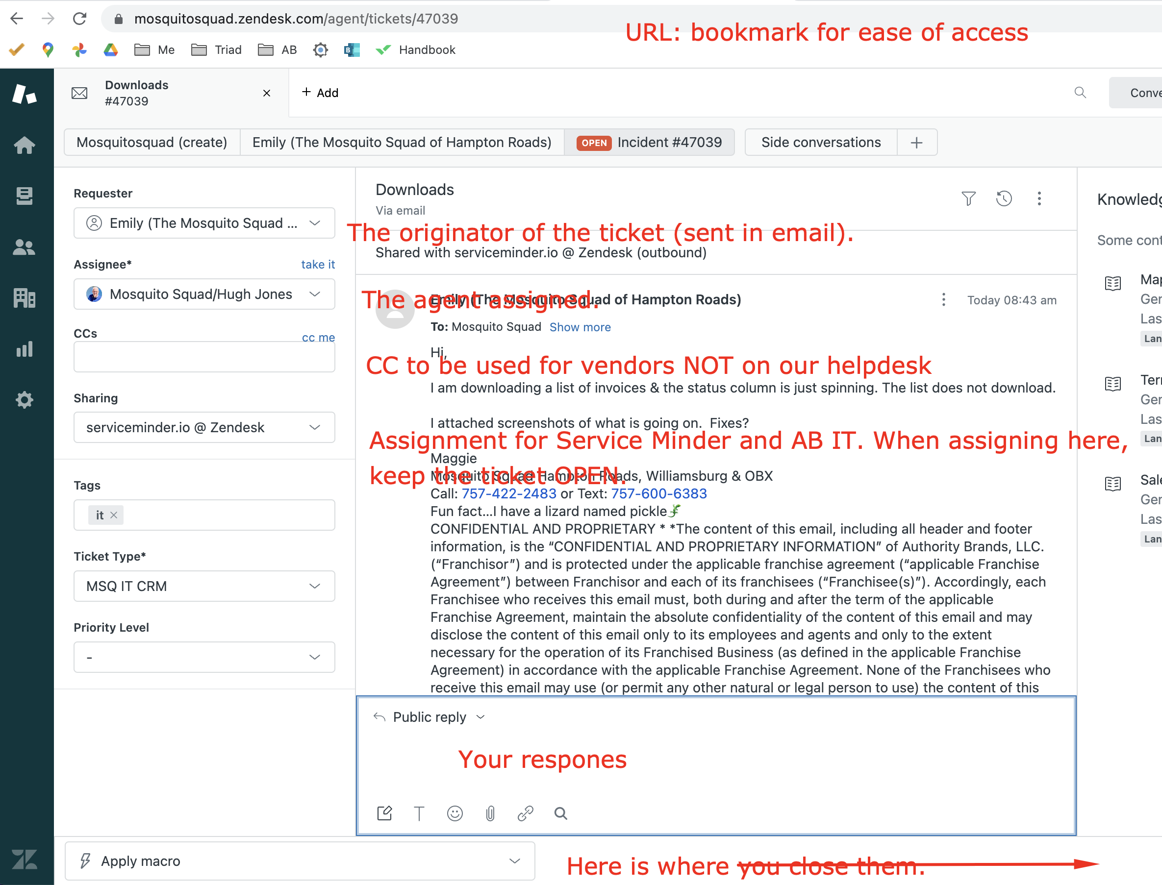 Helpdesk access for staff uses your Authority Brands email/login and password to https://mosquitosquad.zendesk.com/. It is recommended that as an agent you bookmark that takes you to your agent account as below, then select and set url.