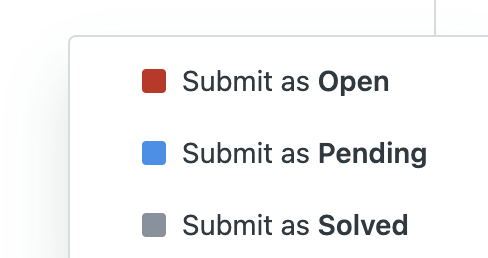 The status at the bottom right is set once everything else is complete. Open is acting and being worked upon, Pending is waiting on information from the submitter, and Solved is, well, solved. Leave tickets cc'd, assigned to others, or shared as open.